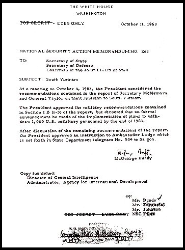 Das NSAM 263 vom 11. Oktober 1963 war ein entscheidendes Dokument aus dem Weißen Haus. Große Teile davon wurden nach Maßgabe der Politik des Weißen Hauses von meinem Vorgesetzten im Pentagon, General Krulak, von mir selbst und von anderen Leuten aus seinem Stab verfaßt. Ich bin mit diesem Memorandum vertraut und kenne auch die Ereignisse, die zu seiner Niederschrift führten.